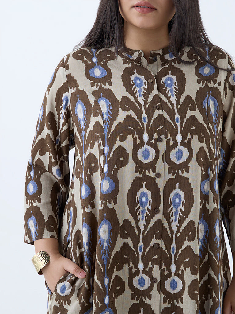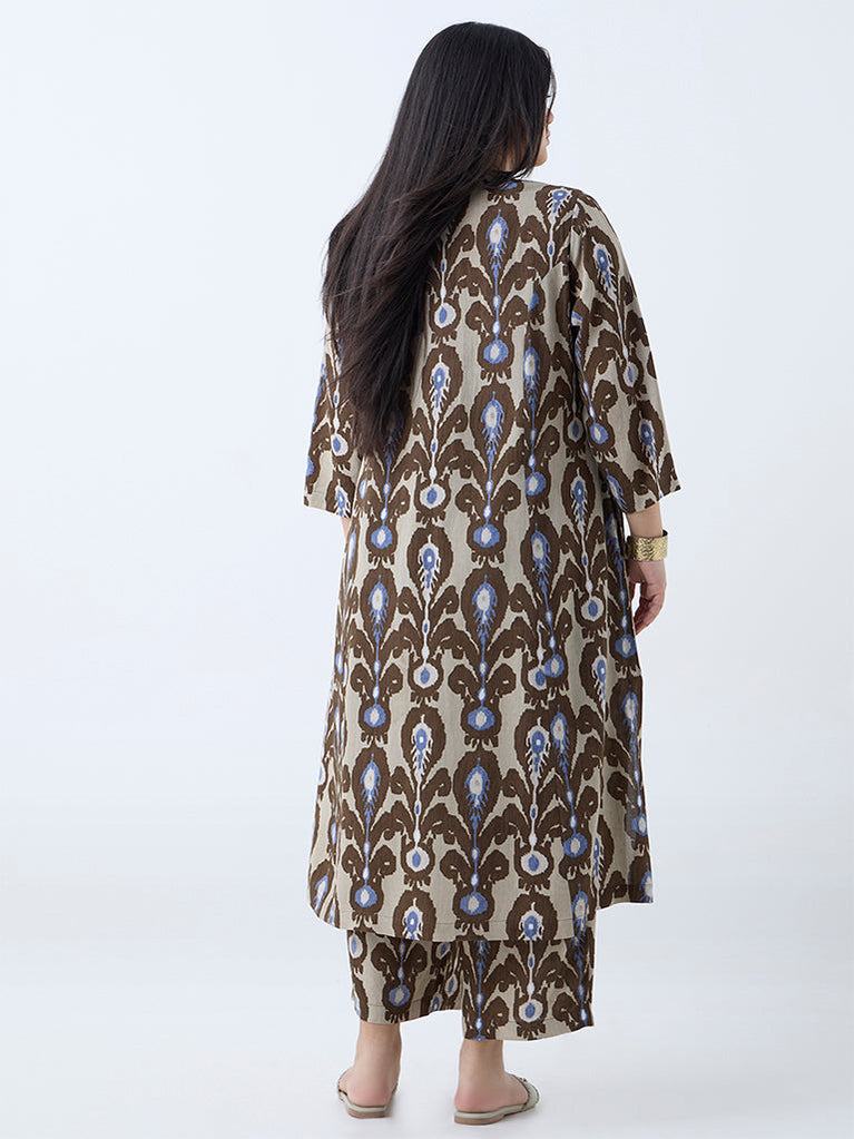 This brown kurta from Diza stands out with its woven ikat-inspired pattern that adds texture and visual interest. Made from high-quality fabric in an A-Line frame, it’s designed with a band collar, a buttoned placket, and three-quarter sleeves for everyday ease. A discreet side pocket adds thoughtful functionality.