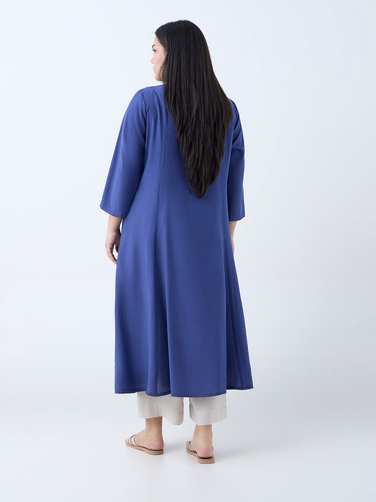 Diza Blue Floral Detailed A-Line Cotton Kurta