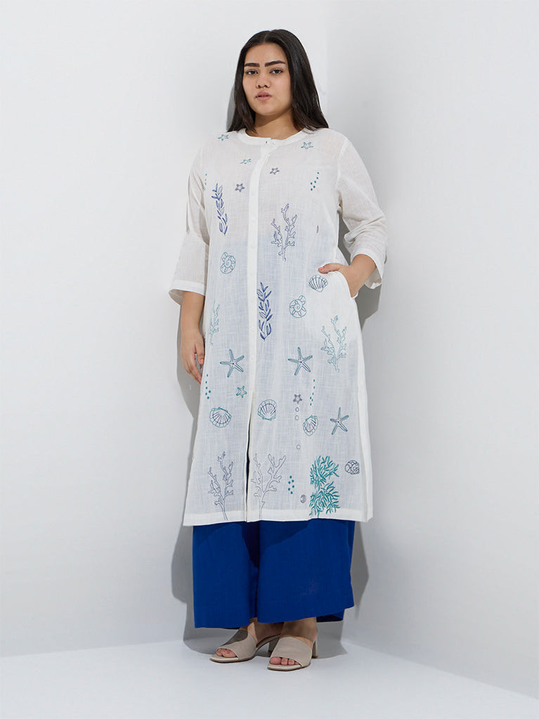 Diza White Sealife-Themed Cotton A-Line Kurta