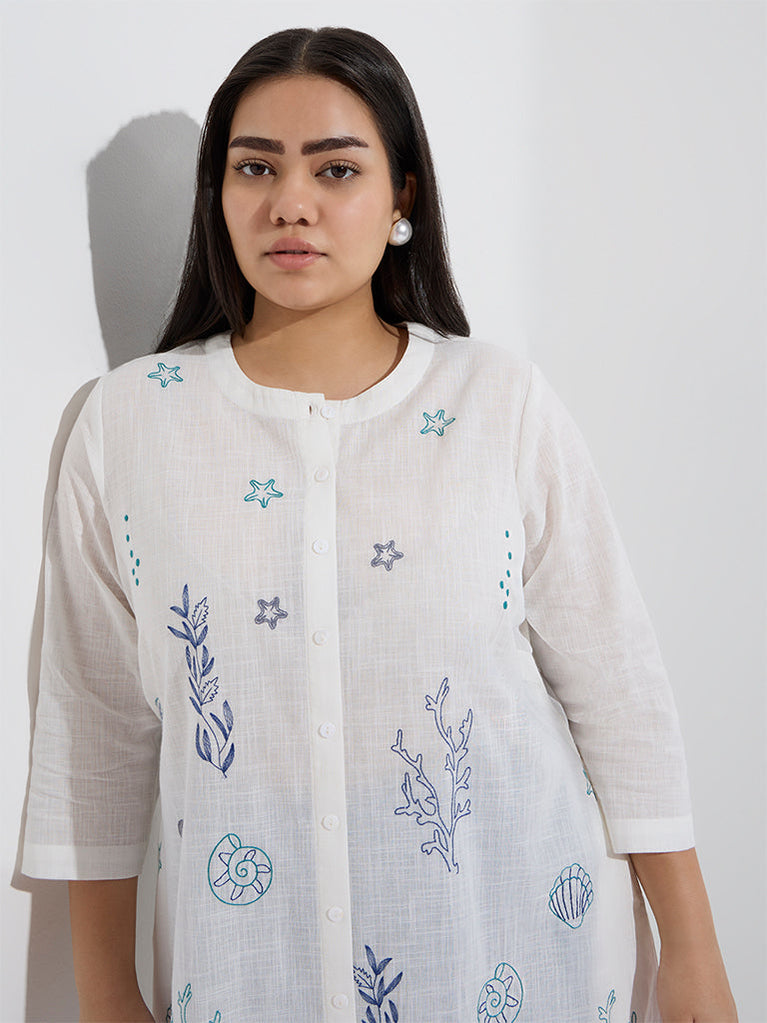This white kurta from Diza is detailed with Sealife-themed prints, bringing a playful yet elegant touch to your look. Milled from pure cotton, the A-line silhouette is complemented by a round neck, button placket, and three-quarter sleeves. Practical side pockets add a layer of ease to the design.