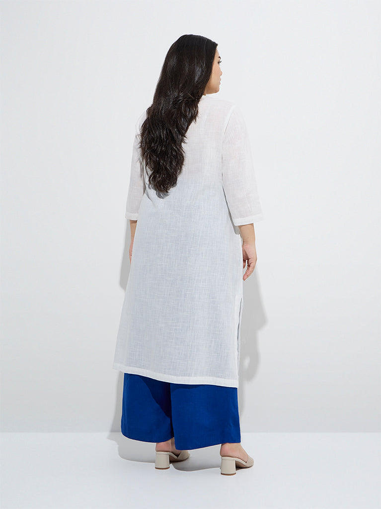 Add a touch of grace to your ethnic wardrobe with this white kurta from Diza. Milled from pure cotton, it features tropical-inspired embroidery in a flattering A-line silhouette. Designed with a V-neck and three-quarter sleeves, it also includes slip pockets for practical convenience.