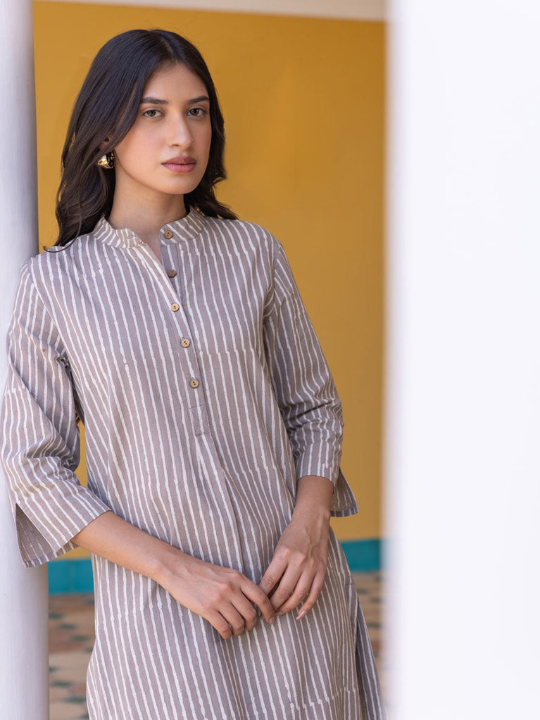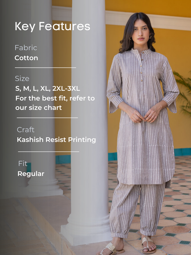 An everyday wardrobe essential, this straight kurta features meticulous handblock printing. It includes striped detailing along the sides and sleeves, complemented by a dori tie-up at the front and delicate sequins along the neckline.