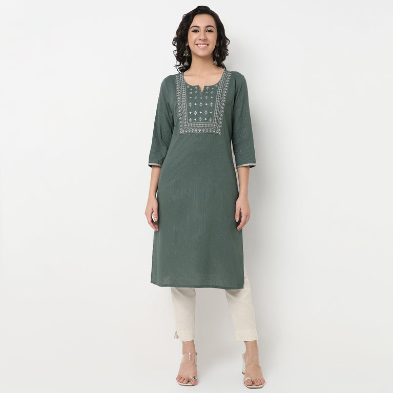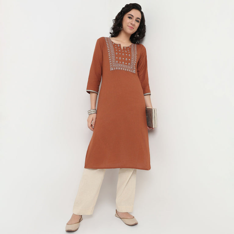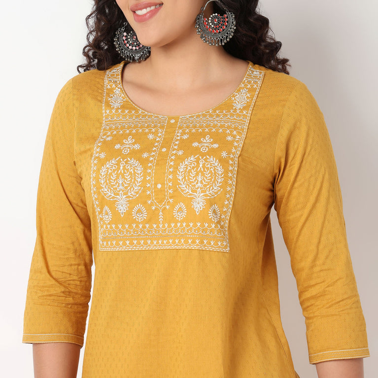 Elevate your wardrobe with the Embroidered Yoke Long Kurta, a perfect blend of comfort and style. Crafted from woven cotton, this knee-length kurta is designed for the modern woman who appreciates intricate detailing.