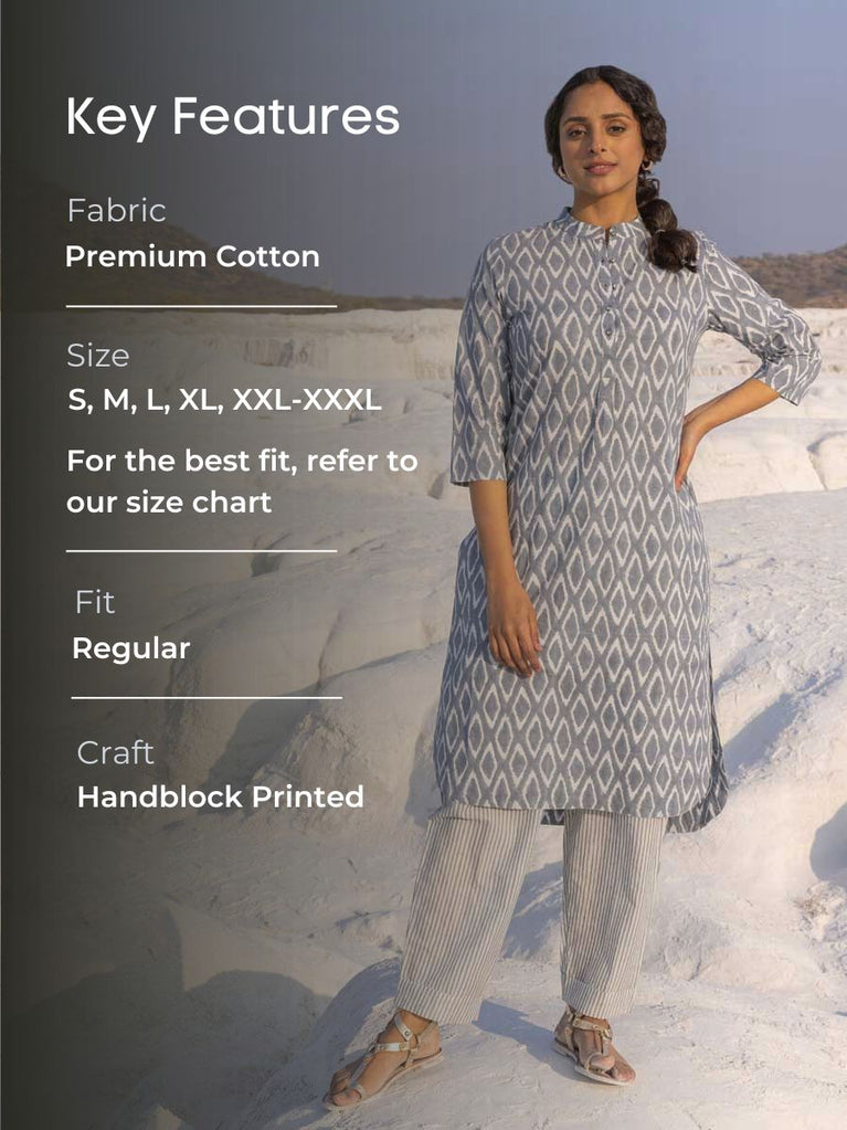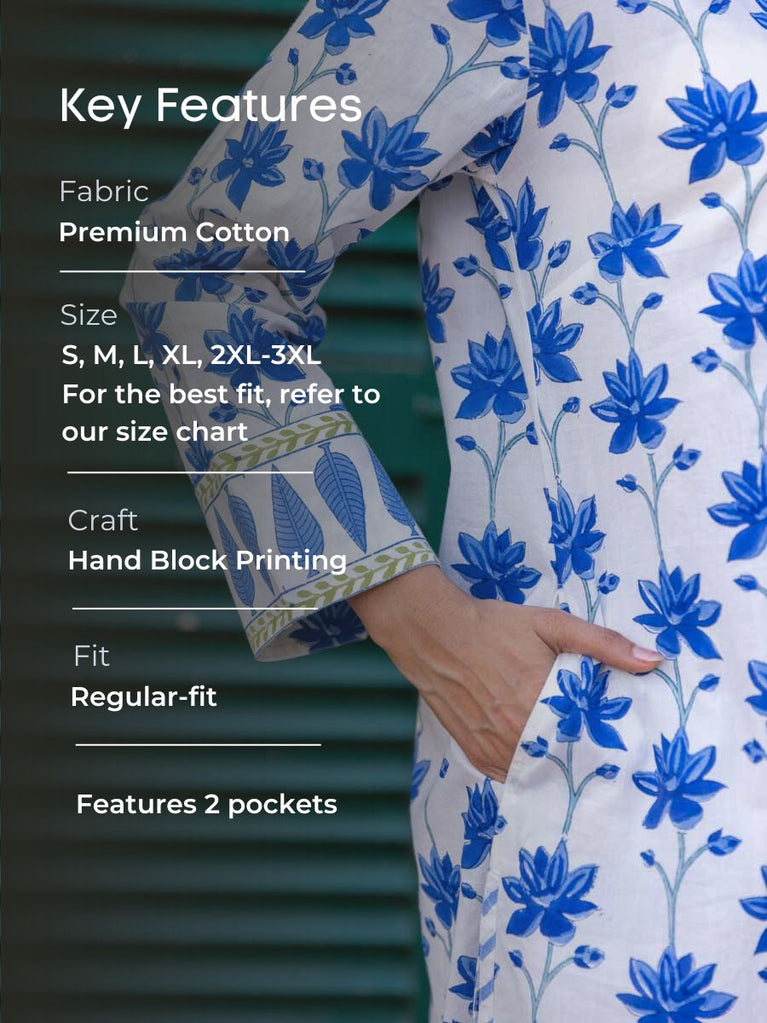 Inspired by heritage craftsmanship, this indigo flared kurta showcases the beauty of Daboo hand-block prints on soft pure cotton. The flowing flared silhouette offers graceful movement while keeping you comfortable through the day. Its natural indigo palette and artisanal print give this cotton kurta a rustic yet refined look, perfect for casual brunches or art-inspired evenings. The breathable fabric and easy fit make it a summer essential, whether styled with ethnic or contemporary pieces. Elevate your kurta for women collection with this handcrafted statement.