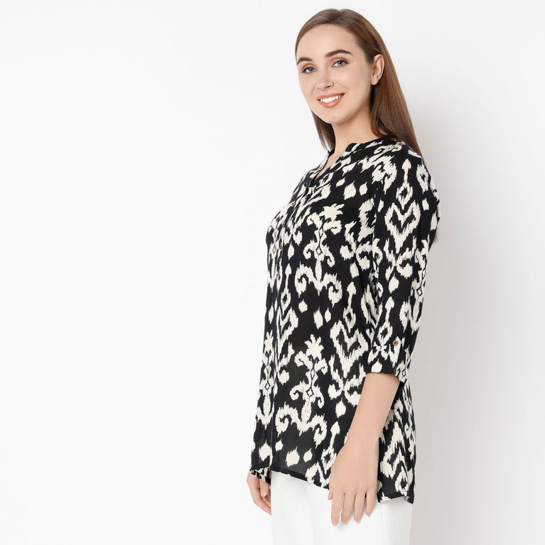 Band Neck Three-Fourth Sleeve Straight Fit Printed Short Kurti