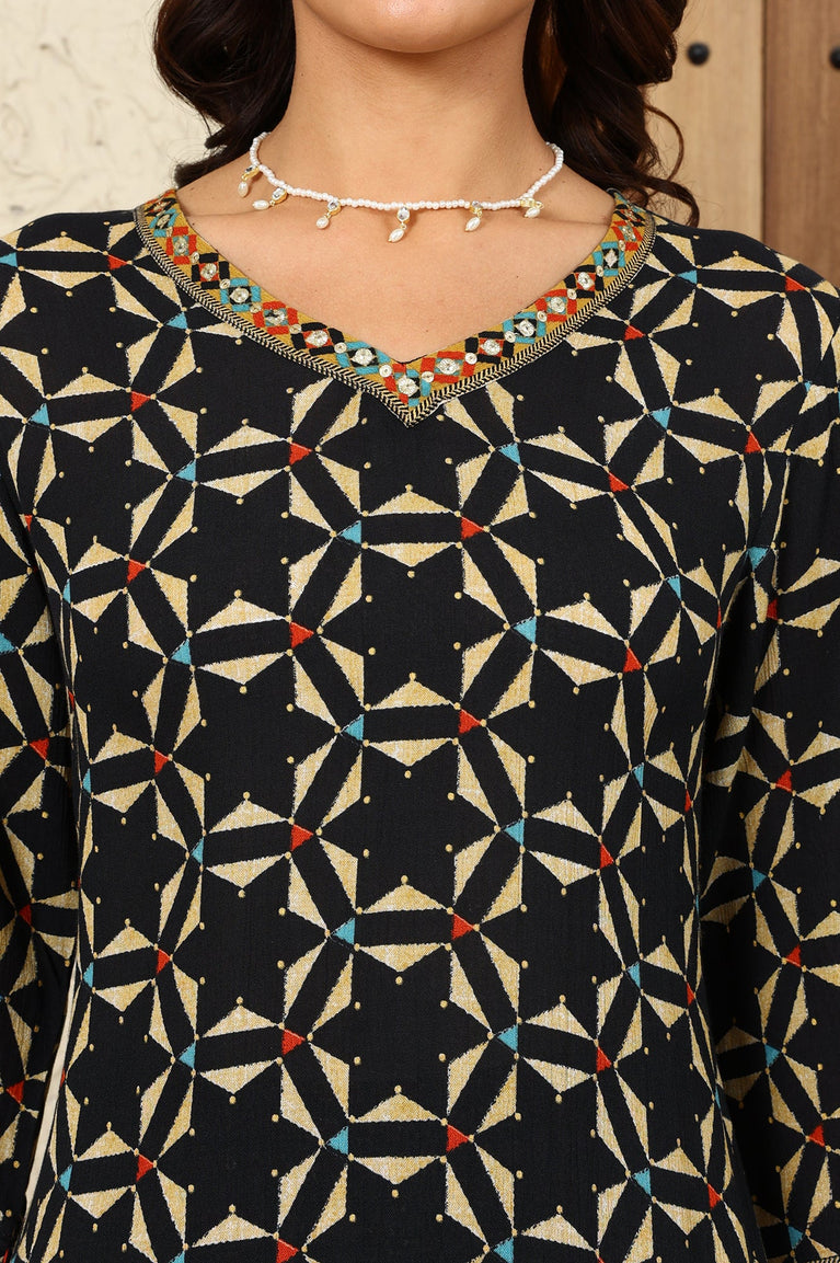 Black Geometric Printed V-Neck Rayon Crepe Kurta With Sequin Detailing