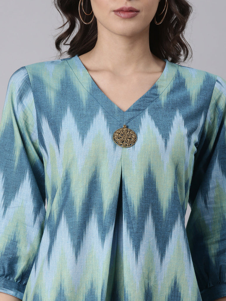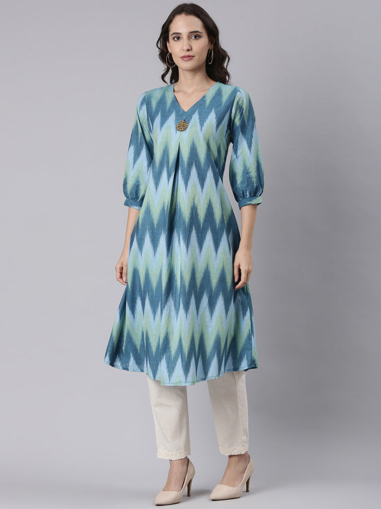 Experience timeless elegance with this blue cotton ikat printed kurta. Crafted from breathable cotton, it offers comfort while showcasing intricate ikat patterns that add a refined touch. Perfect for both casual gatherings and festive occasions, this kurta blends traditional artistry with modern sophistication for a graceful look.