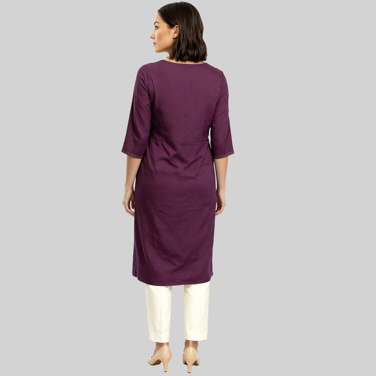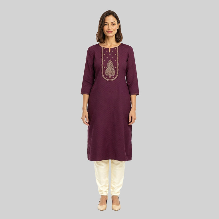 This embroidered pattern kurta has a round neck and three-fourth sleeve. Made from cotton, it is soft and comfortable to wear.