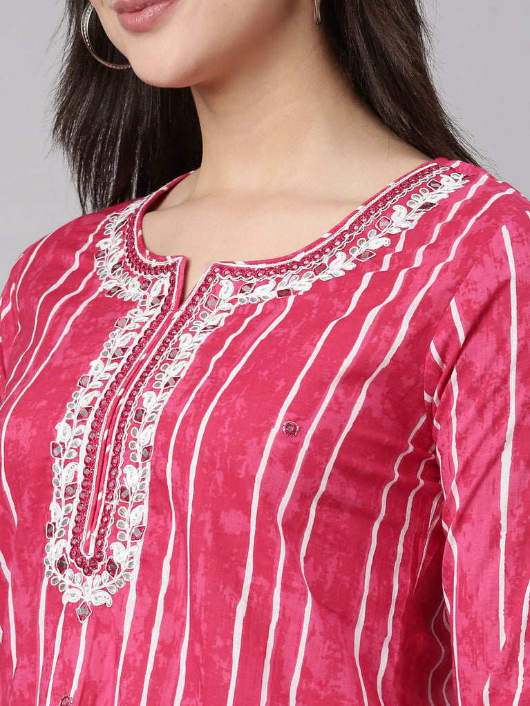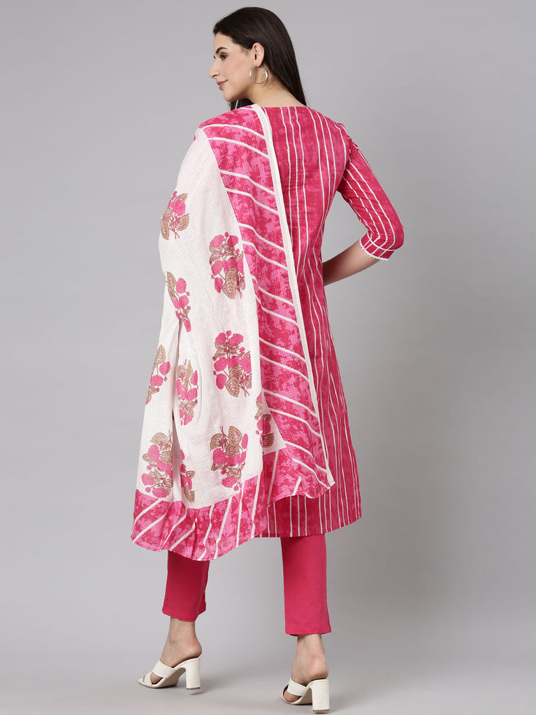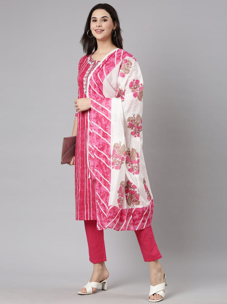 Neerus Pink Regular Straight Striped Kurta And Trousers With Dupatta