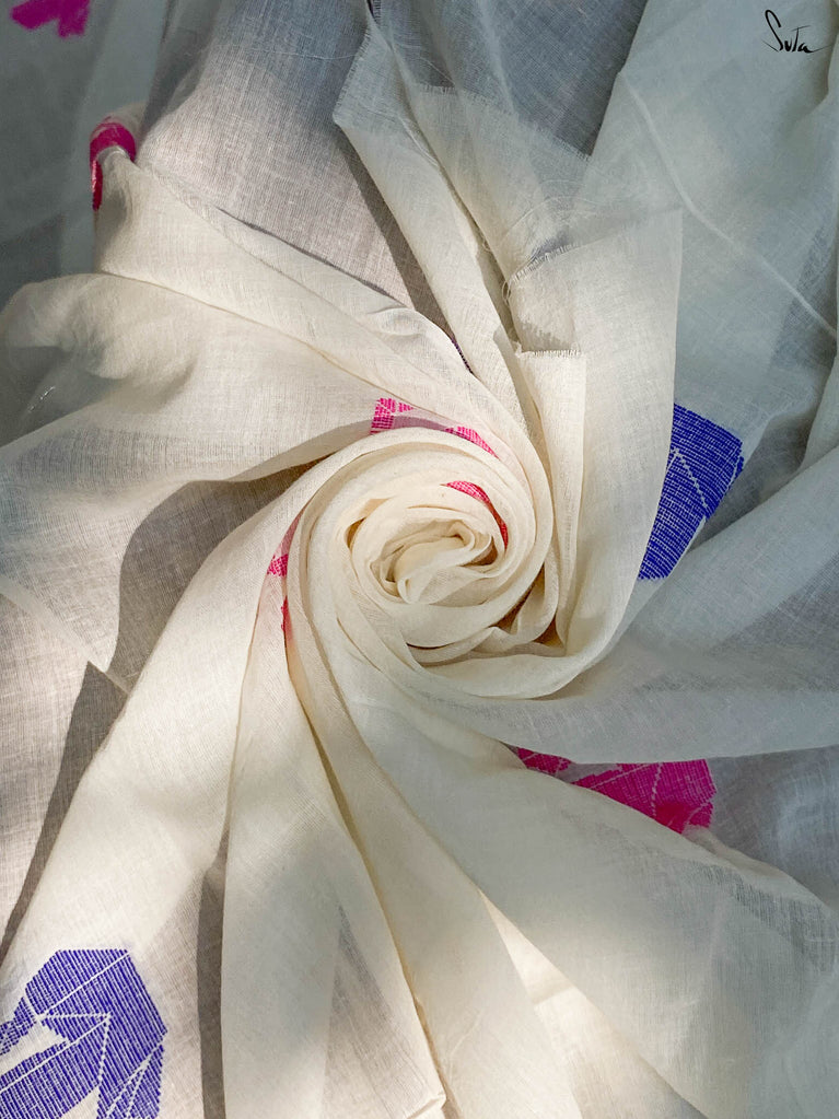 Suta’s ‘made in heaven’ mul cotton, is also known as mul mul in West Bengal. The fabric is buttery soft and has a delicate beauty. Its weave is very fine and this lends a very fluid texture to the fabric, which makes draping it a breeze. It truly is like a hug that wraps you in its love.