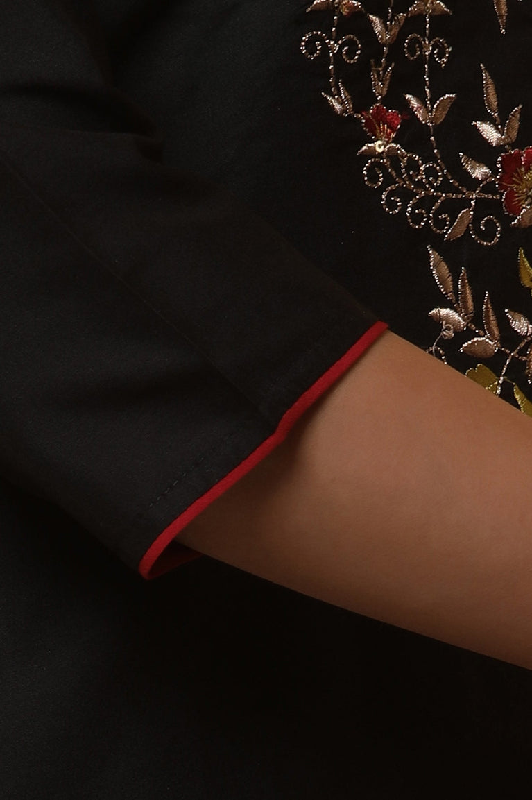 Get Ready For The Elegant And Stylish Office Look With This Printed Black Shirt Kurta. The Kurta Has Mandarin Collar And Button Placket. It Is Paired With Black Slim Pants Having Contrast Embroidery On Hemline.