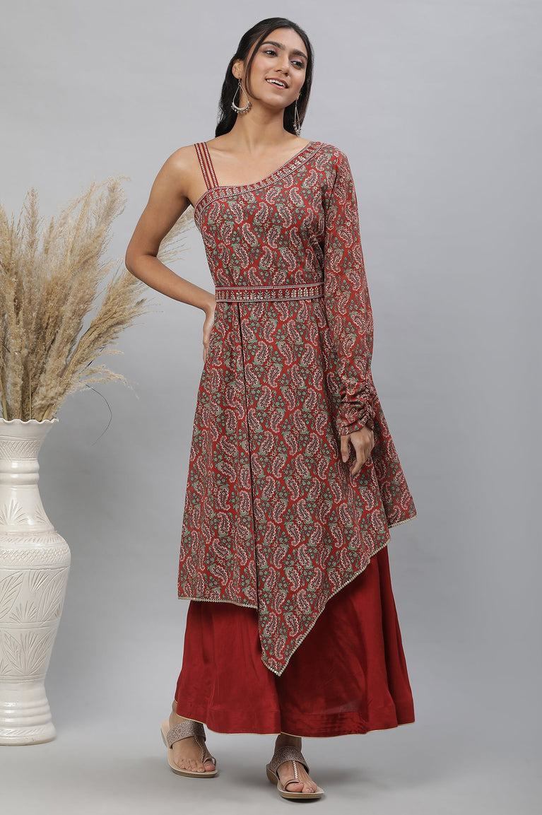 A stylised layered dress in a rich hue of Red Ochre. This dress has intricate sequin embroidery at the belt and neckline and with its highlow flattering hemline, this style will surely grab all attention. It is a must have for this season.