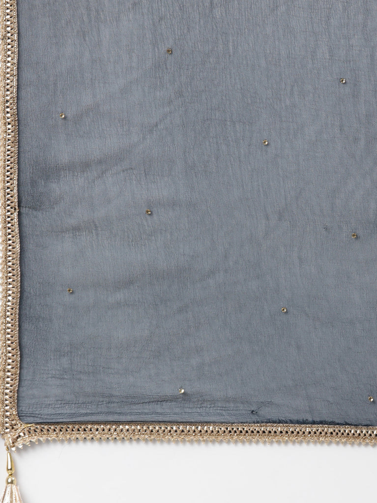 Sleek Neeru's Blue Straight Floral Kurta, Trousers, And Dupatta.