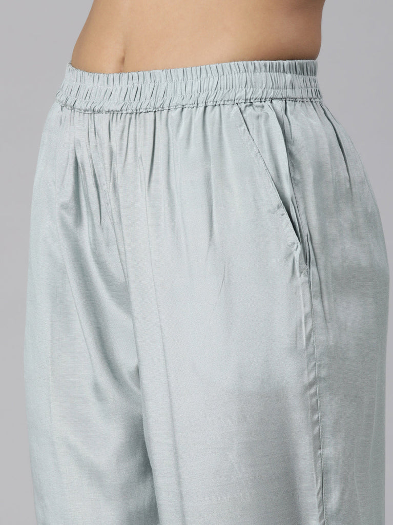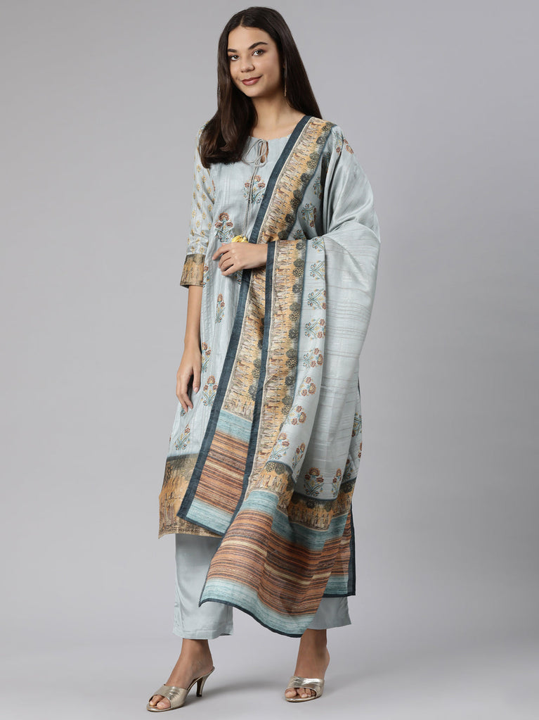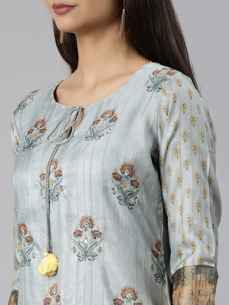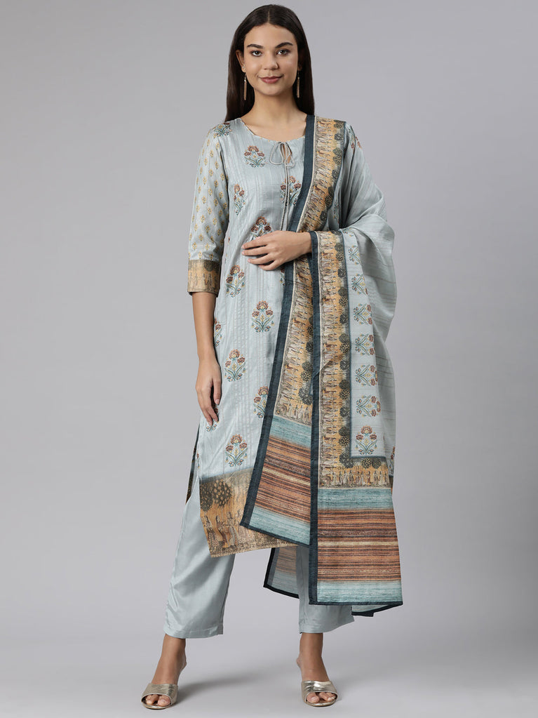 Crafted With A Captivating Blend Of Exceptional Prints And Lush Fabric, Neeru's Blue Regular Knee Length Readymade Suits Is An Embodiment Of Luxurious Sensibility And Sophistication. Along With A Solid-Hued Trousers, This Ensemble Is Complete With A Delicate Dupatta For A Stunning Appeal.