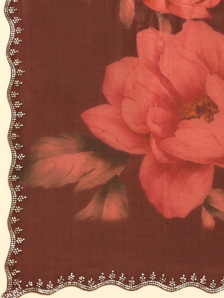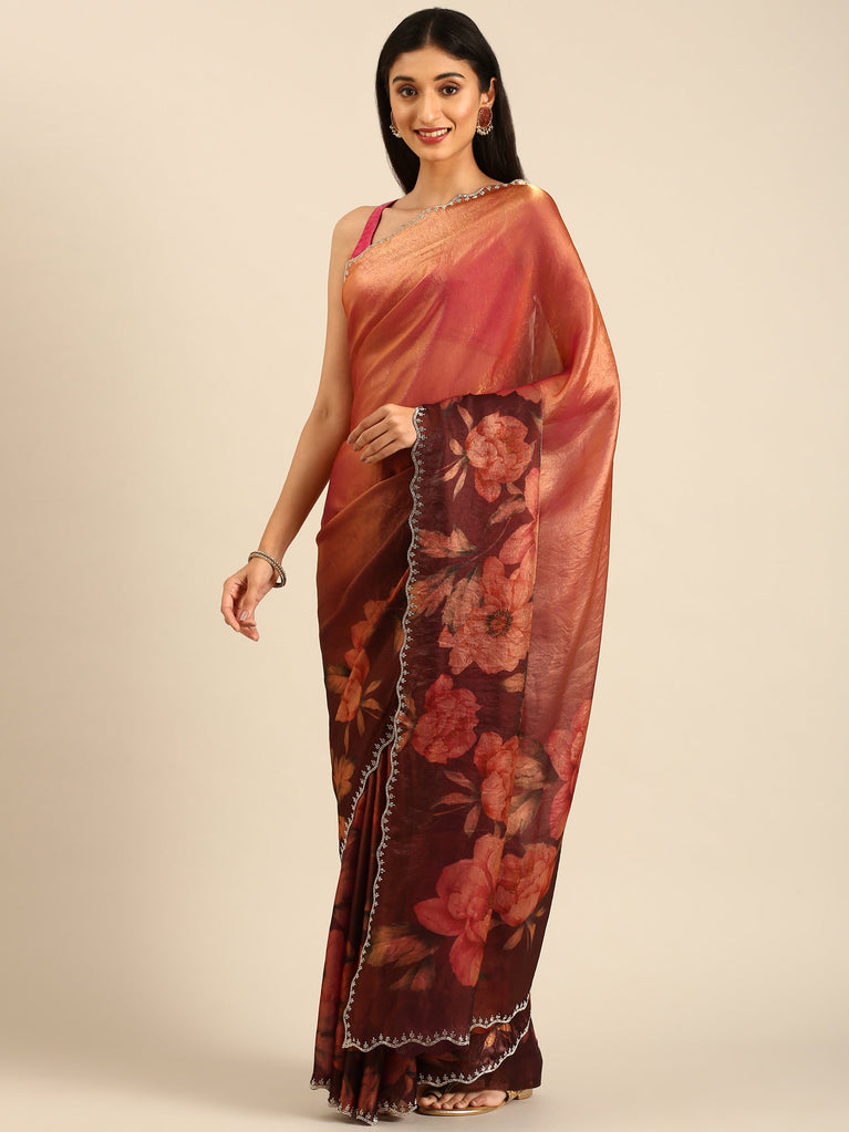 Gold & Maroon Floral Printed Jimmy Tissue Saree With Swarovski Embroidery