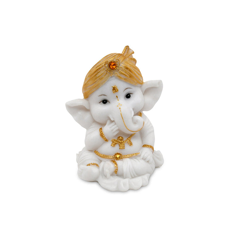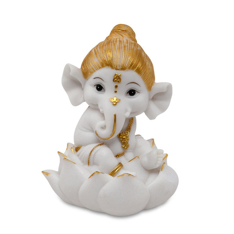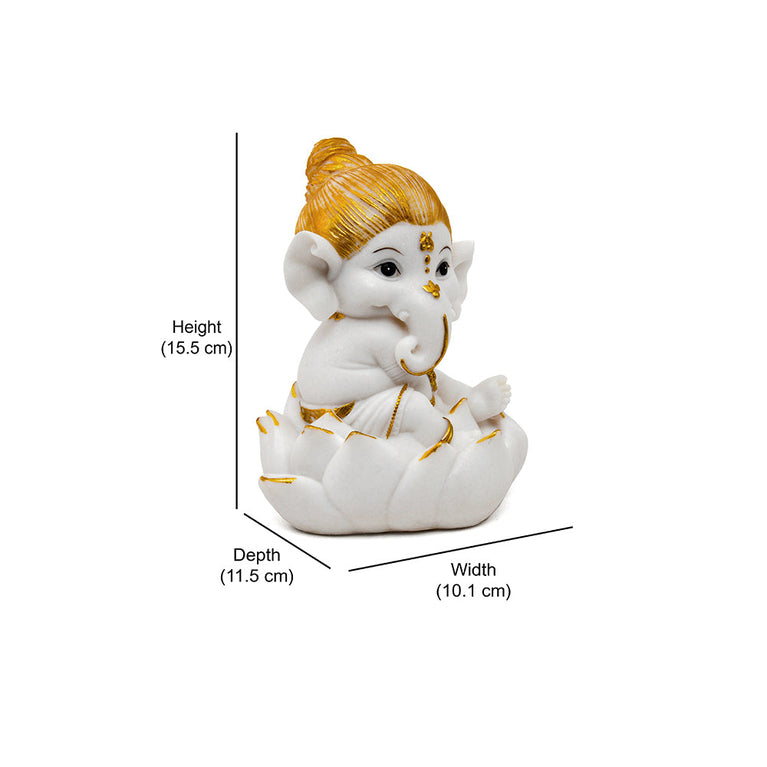 Ganesha On Lotus Polyresin Showpiece (White & Gold)