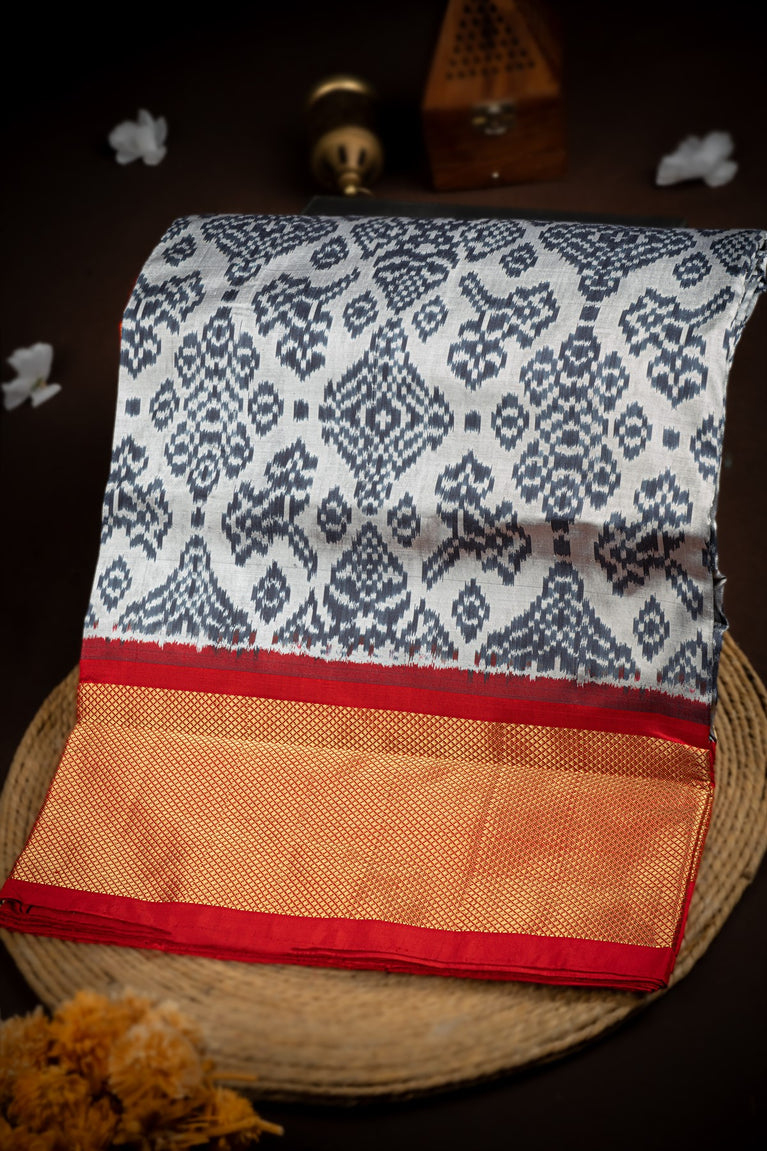 Mandir Dark Grey & Red Kanchi Ikat Ikat Saree