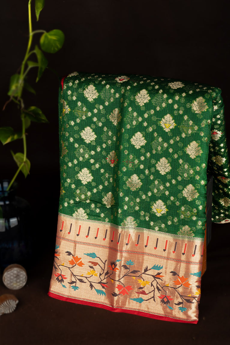 Mandir Green & Peach Pink Paithani Checks And Buttis Saree