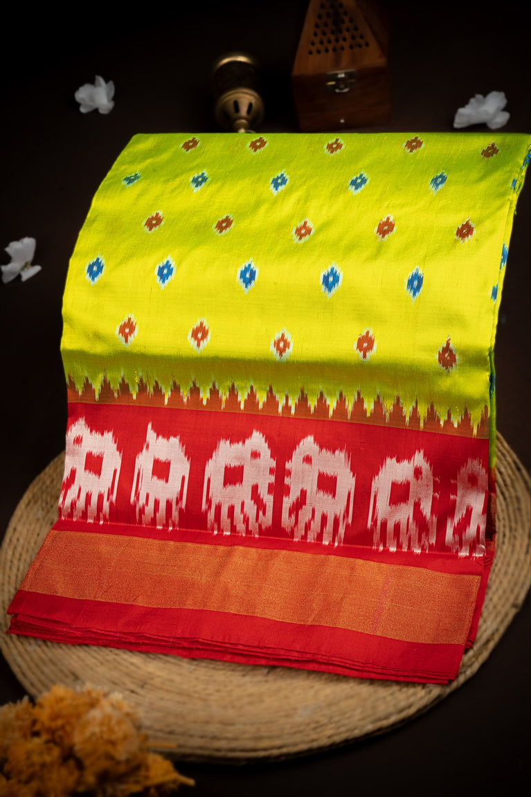 Mandir Lemon Yellow and Green & Red Ikat Ikat Saree