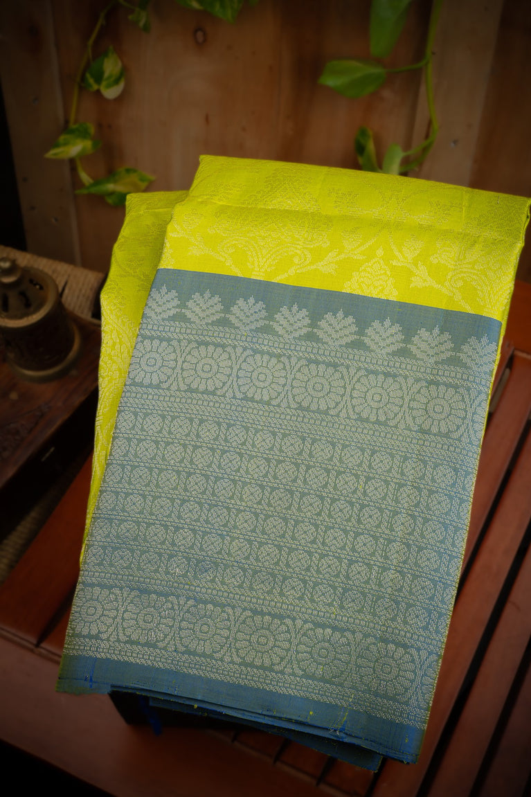 Mandir Lemon Yellow & Grey Kuppadam Buttis Saree