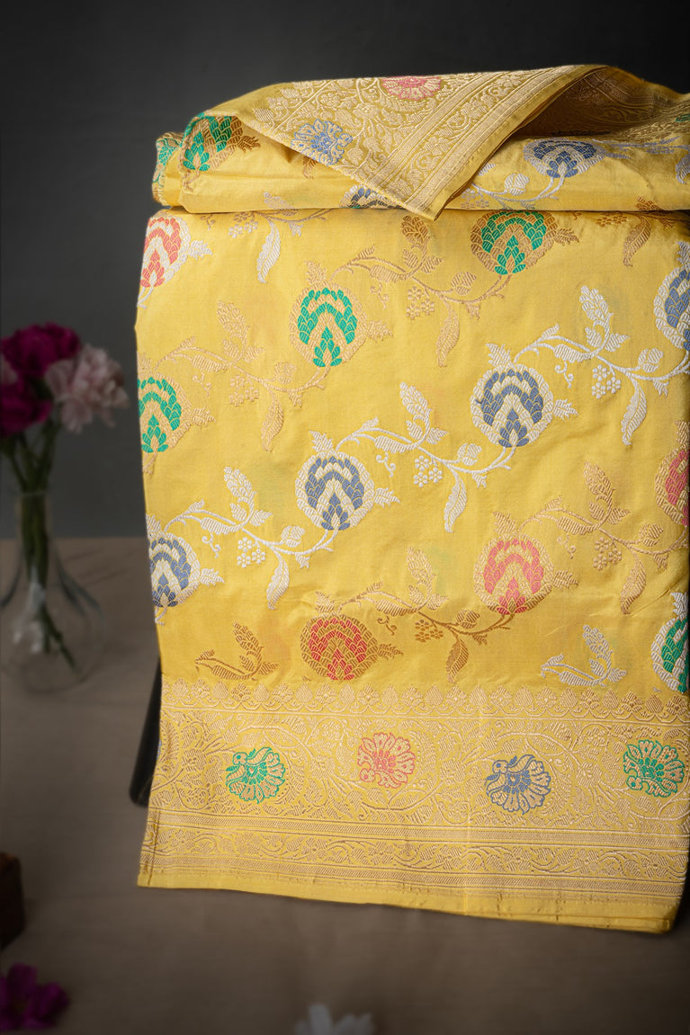Mandir Lime Yellow & Blush Pink Banarasi Florals Saree