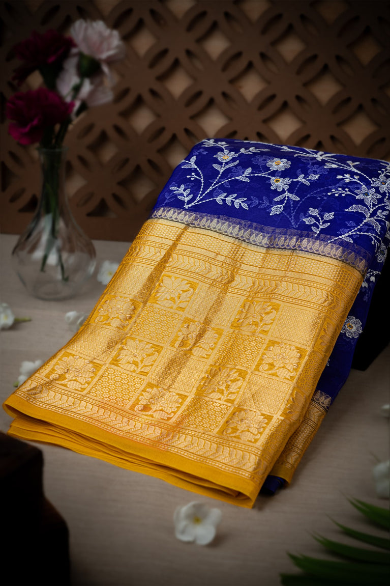 Mandir Royal Blue & Mustard Fancy Work Saree