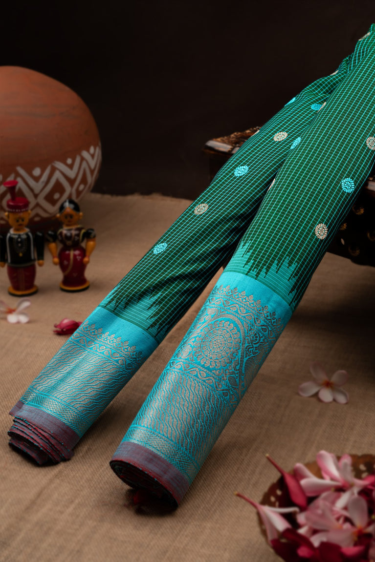 Varamahalakshmi Green & Light Blue Gadwal Checks And Buttis Saree