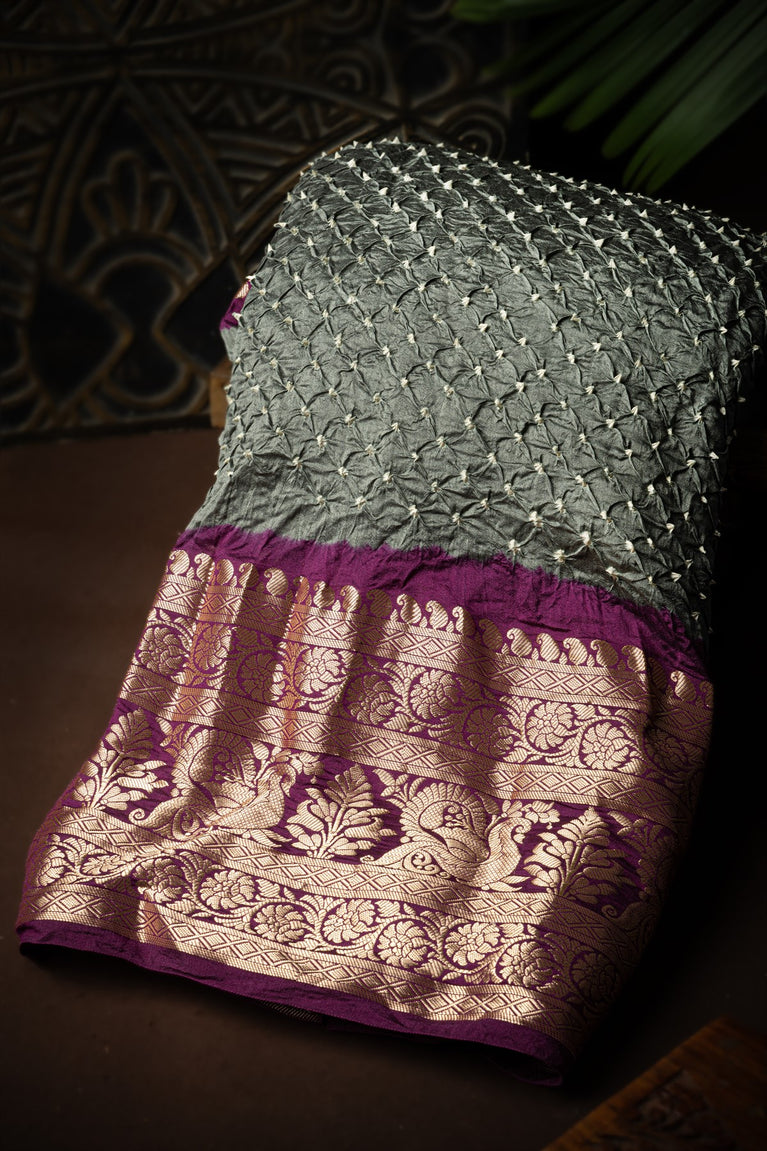 Varamahalakshmi Grey & Purple Bandhani Bandhani Saree