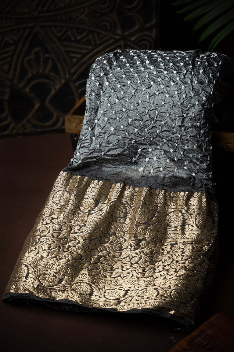 Varamahalakshmi Grey & Black Bandhani Bandhani Saree