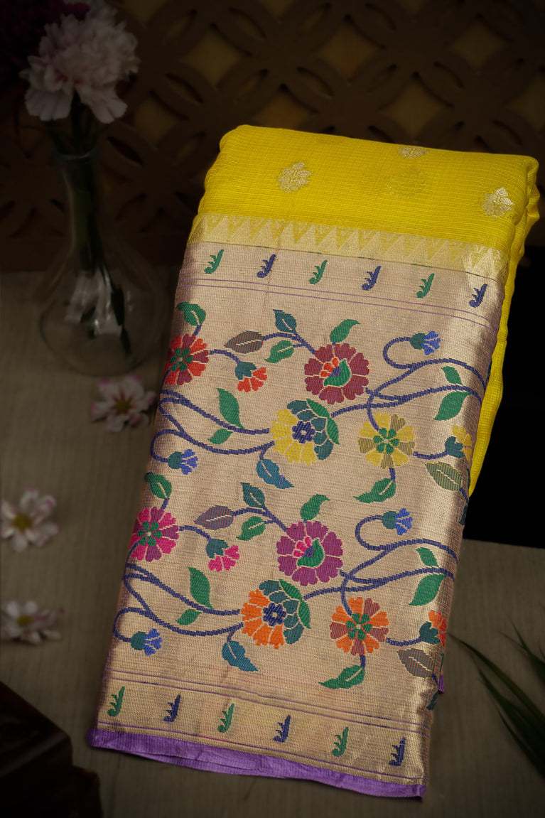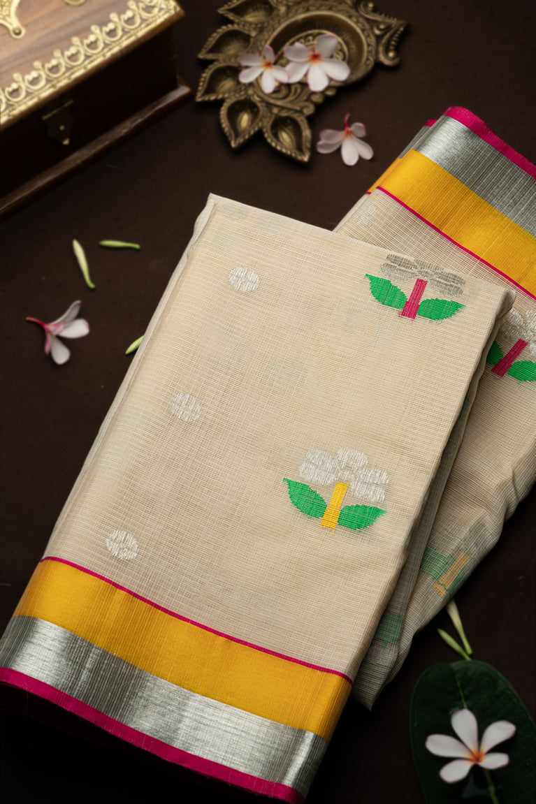 Varamahalakshmi Lime Yellow & Pink Zari Kota Floral Buttis Saree
