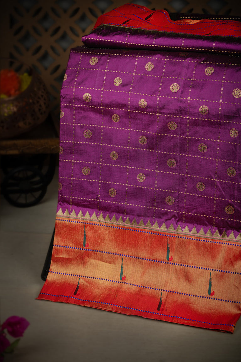 Varamahalakshmi Magenta & Gold and Red Paithani Checks And Buttis Saree