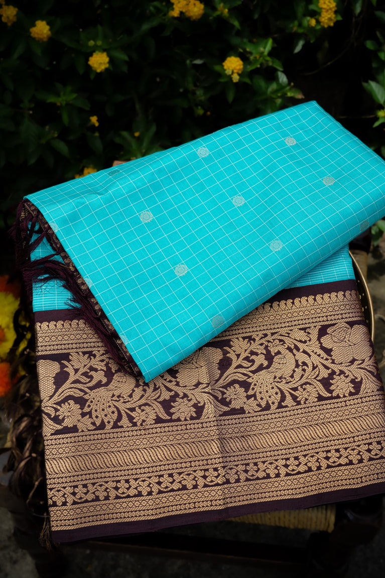 Varamahalakshmi Sea Blue & Brown Kuppadam Checks And Buttis Saree