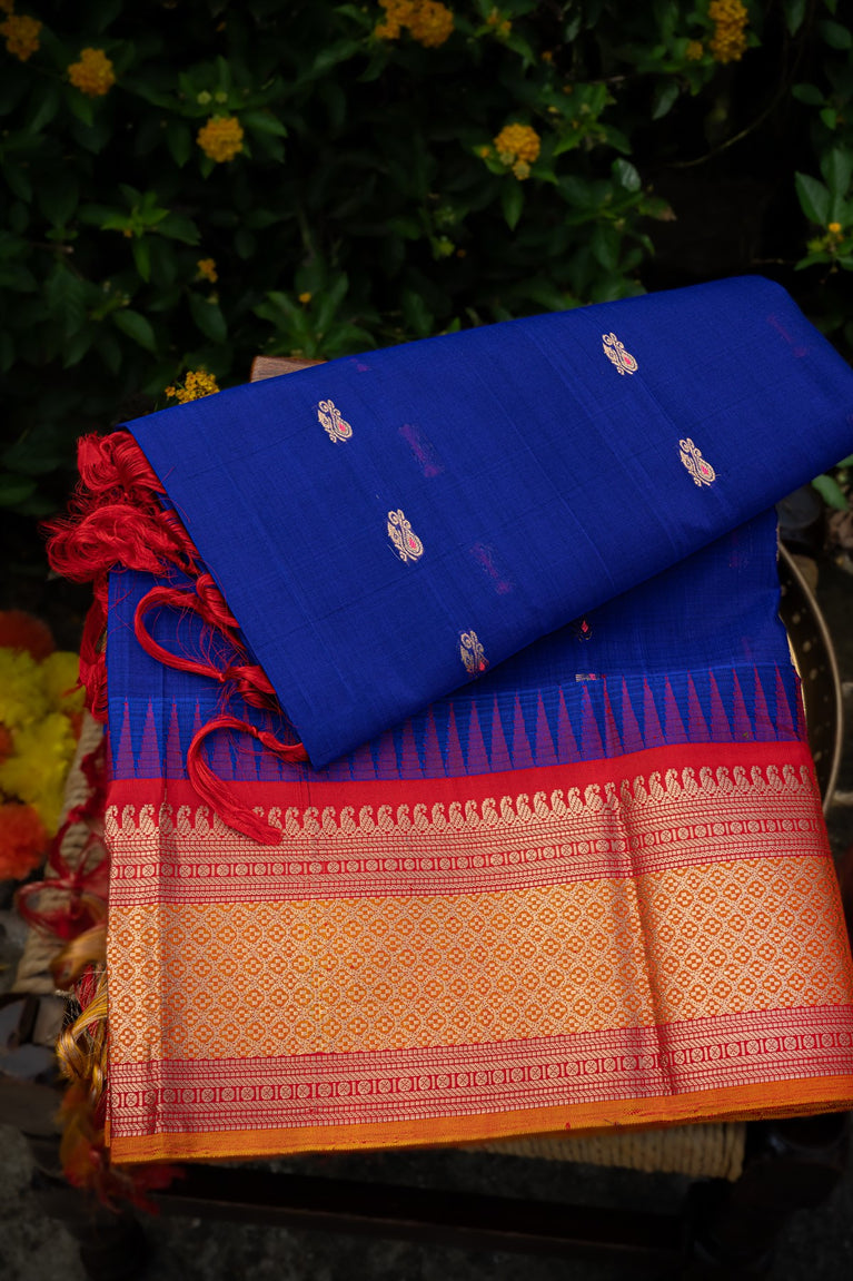 Varamahalakshmi Royal Blue & Tangy Orange Kuppadam Buttis Saree
