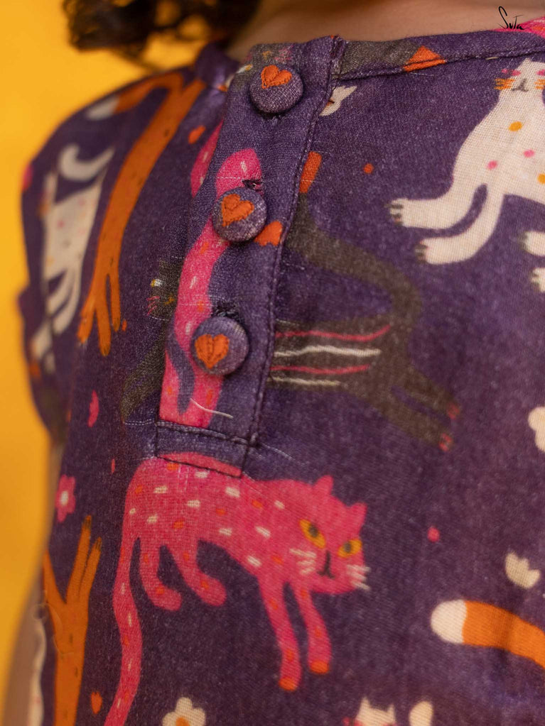 Checks with a twist! This purple cotton midi dress redefines a classic in V-neckline with contrasting mustard blanket stitches, a design detail that subtly draws attention. The breathable cotton keeps it summer-ready, while the puff sleeves and easy flare make it an all-day comfort pick. It’s your go-to for market strolls, casual catch ups, or just feeling cute on a weekday.