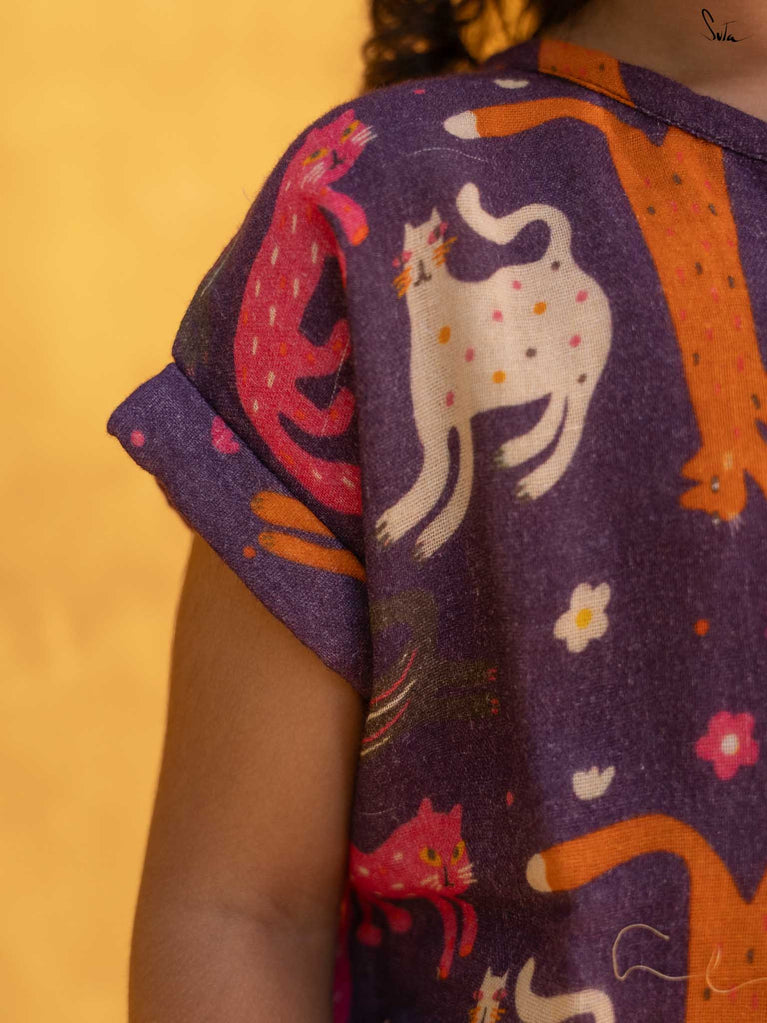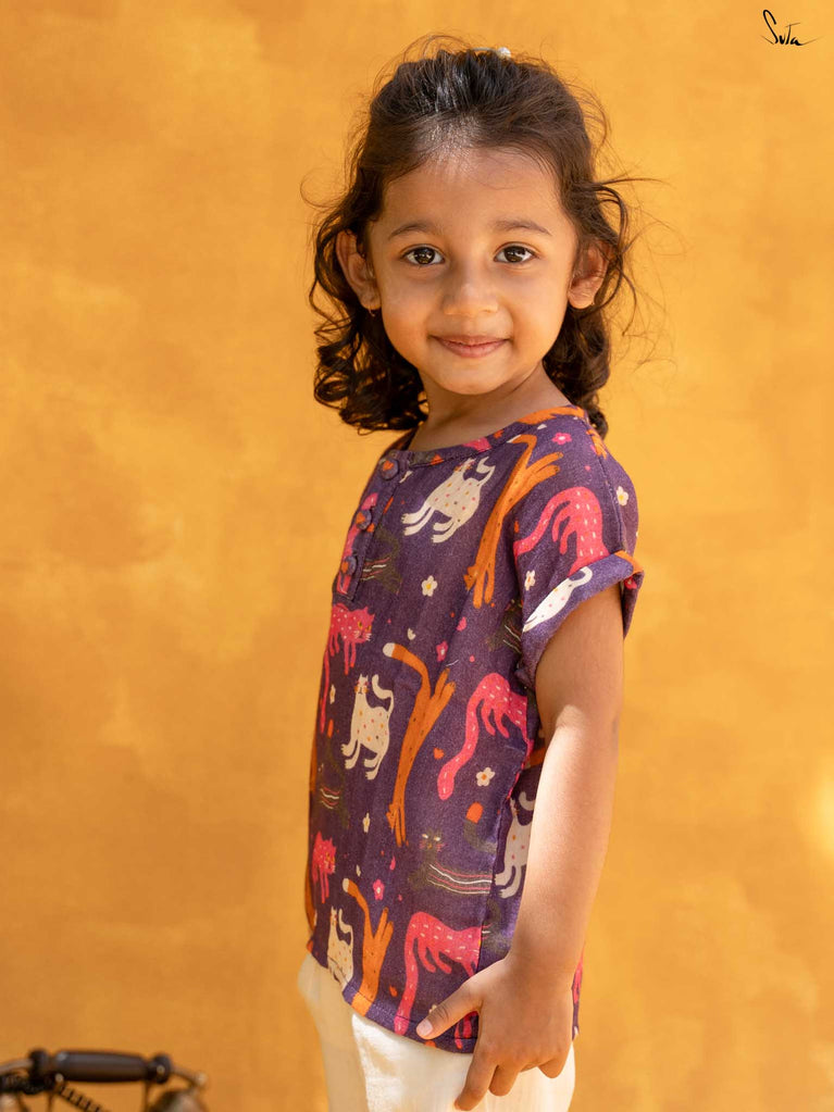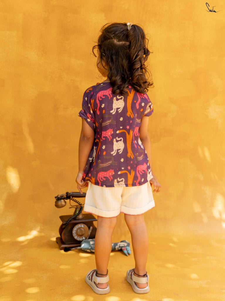 “The cat went fiddle-i-fee…” Zoom like a zigzagging kitty in this fun-packed co-ord! The multi-colored printed shirt is full of personality, with embroidered buttons that dance down the front like a treasure trail. Paired with crisp white contrast pants, featuring delicate buttonhole embroidery at the hems, this outfit is perfect for doodle days, bedtime dances, and every silly moment in between.
