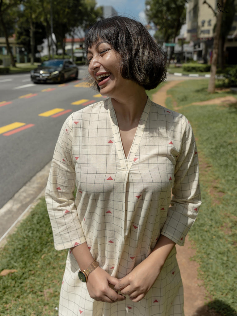 Soft and serene, Creamy Checks is a white cotton co-ord set that feels like a gentle breeze. The boat neckline and pockets add modern flair. Perfect for brunches or minimalist gatherings. Style with sleek gold accessories and understated flats.