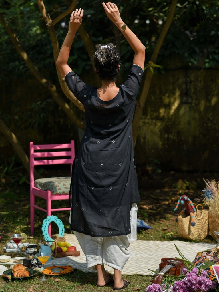 This handloom cotton kurta in black with red and white detailing has been made with as much love as you knew of during the growing-up years. Drape it to experience the warmth of your childhood, and then some more.