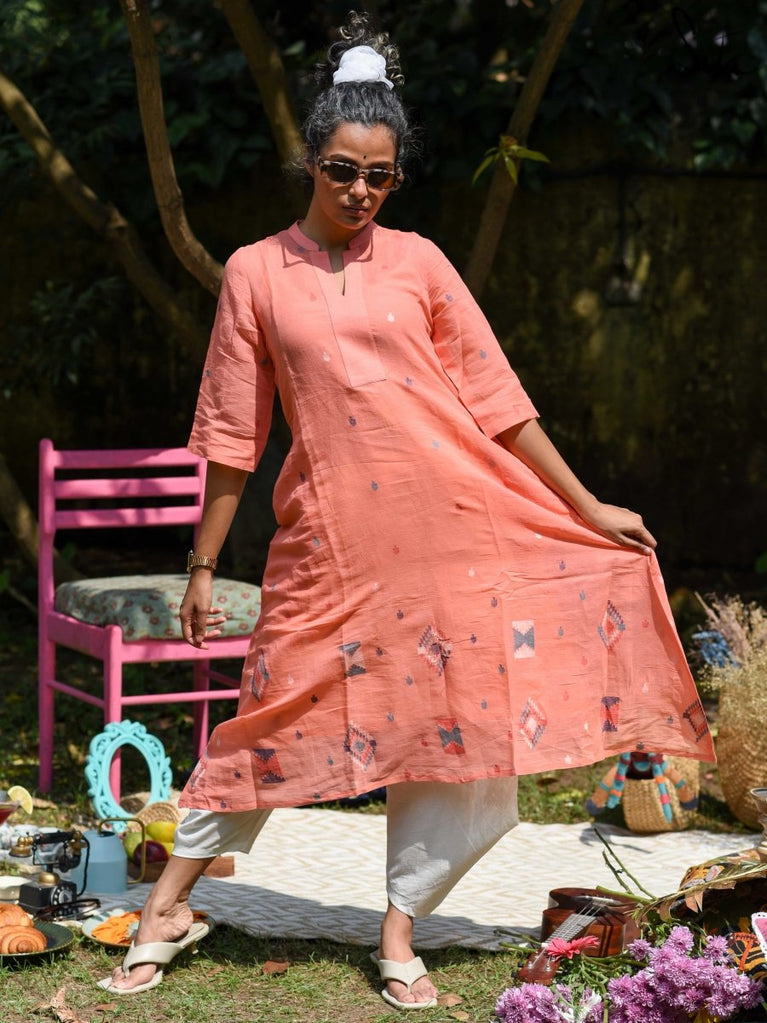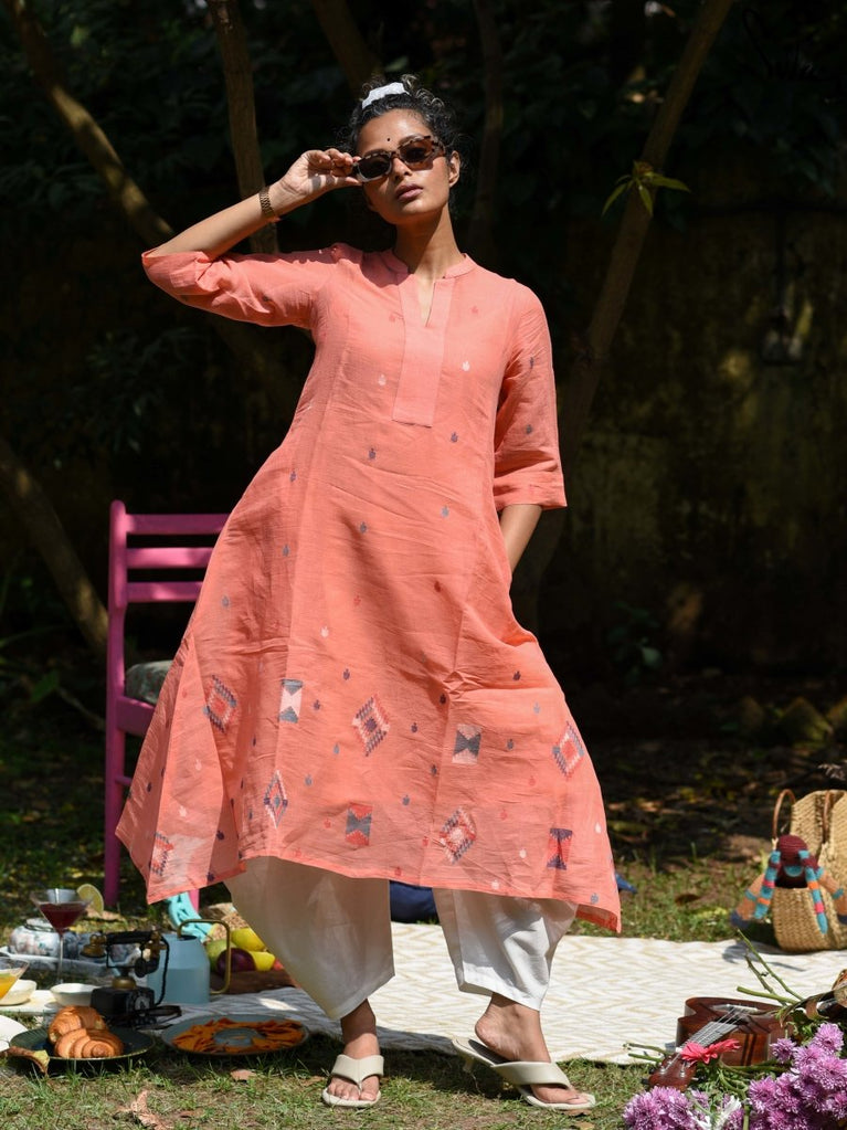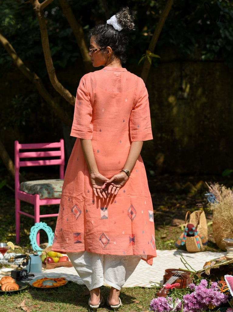 Reminisce about your sweetest memories, when you wear this beautiful orange kurta that’s paired with white bottoms. The kurta is made of handloom Jamdani cotton, while the bottoms are made of silk. This set includes an under-layer.
