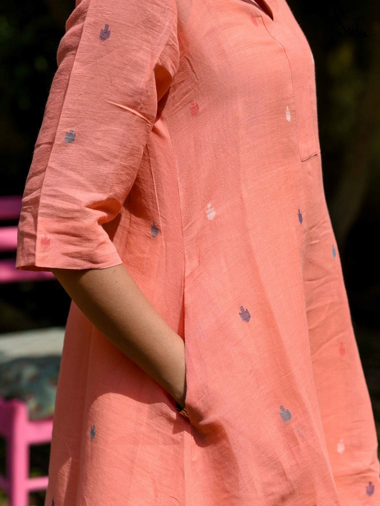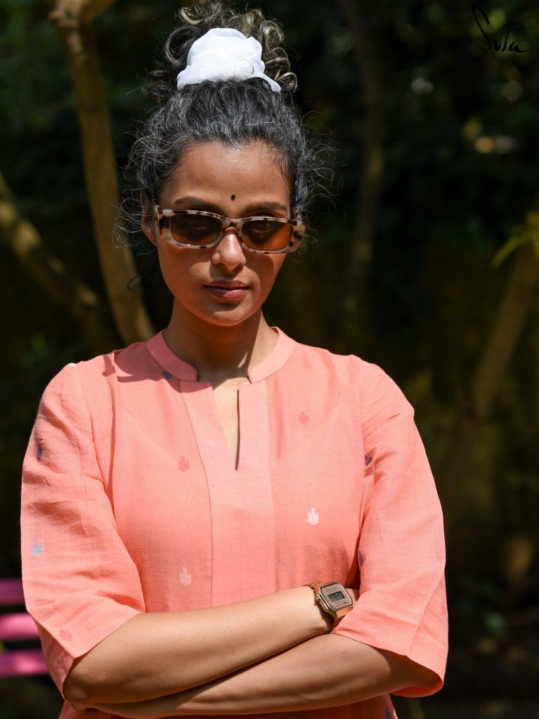 Handloom cotton is handwoven by our weavers on mechanical looms. The process is time and labour-intensive, using techniques that have been passed down across generations of artisans. The resultant fabric is extraordinarily soft, breathable and resilient, and also drapes very well. Using handloom cotton not only helps us to work with smaller weavers but also plays an important role in reducing the environmental footprint of the garments we produce.