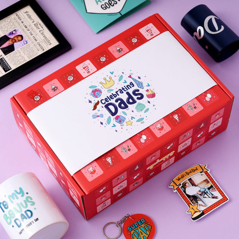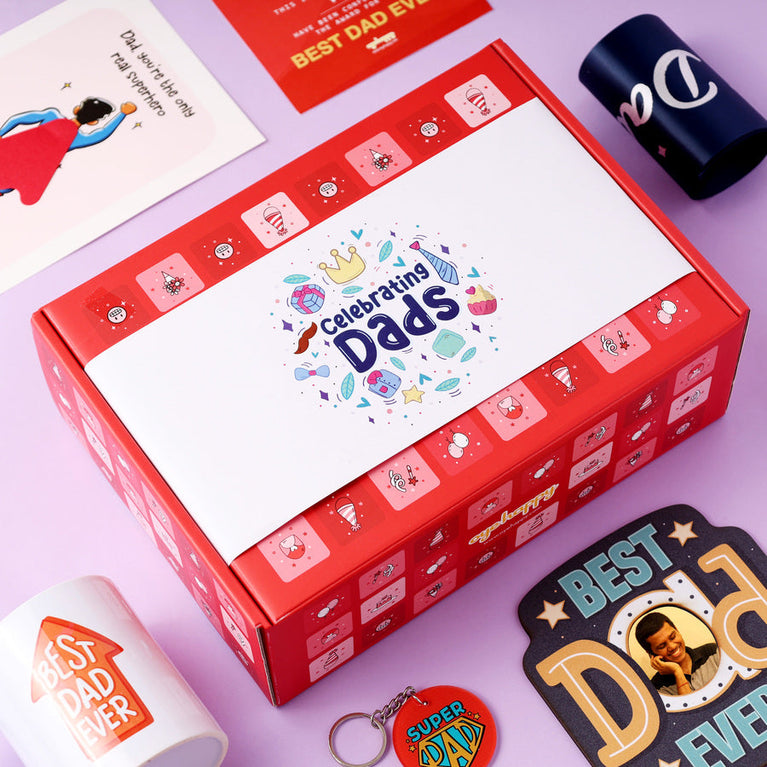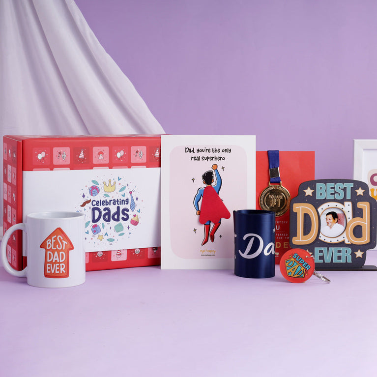 Dads don’t ask for praise, but they deserve all of it. They are the quiet strength behind our loud successes. Celebrate the man who gave you roots and wings. This Hamper is just a small thank you for his giant role. Oh, and you know what's the most unique and cutest part of this hamper? The moment the box is opened, your dad will be greeted with a glitter shower popping out of the hamper box!This hamper includes the following 6 surprises to make your dad smile:Medal with Certificate - Dads deserve all the appreciation in the world for everything they do. Give him the ultimate compliment with a certificate and a medal (yes, a real medal) that certifies your dad as the Best Dad Ever.Best Dad Ever Mug - Surprise your father with a special mug designed to remind him everyday that he's the best dad in the world.Best Dad Ever Table Top - An intricate work of art to adorn your dad's bedroom with. Made with lots of love and creativity, this gift tells him everyday that he is the best dad ever! And, you know the best part? You can customise the table top with his favorite picture. Go ahead, and make his day. Super Dad Cape Card - Dads are the real superheroes of our lives. Remind your dad the same with a cape card that has an adorable little cape attached to it.A Sash - A real sash for the man who made growing up feel like magic. Make your dad feel special with this adorable world's best dad sash.Super Dad Keychain - He might not have superpowers, but he has loved you the most. This keychain is for the dad who’s always been a hero!Specifications - Size of the Hamper Box : 25 x 10.5 x 19.5 cm Size of the Super Dad Cape Card : 14.8 x 21 cmsCapacity of the Mug : 3330ml Size of the Medal Certificate Card : 12 x 17 cmsBest Dad Sash : Regular SizeSize of the Table Top : 12.7 x 13.7 cmsSize of the Super Dad Key Chain : 5 x 5 cms
