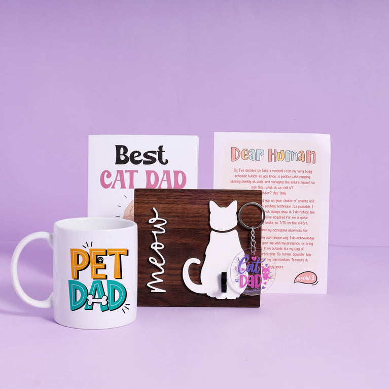 Some dads raise kids. Some raise cats with attitude. For the man who’s mastered the art of head boops, chin scratches, treat time, and silent judgment—here’s a hamper straight from his purring little boss. This Father’s Day, surprise a cat dad with a hamper that is as cool as his kitty.The hamper includes: Best Cat Dad Ever Card - A cute and heartfelt card made just for the cat dad who loves his furry baby like family. Perfect to say thanks and celebrate his special bond with his kitty!Pet Dad Mug - For the man who’s a hero to his cute furry baby, here’s a mug as warm and loving as he is. A perfect gift for every proud cat dad!Letter from Cat - Surprise the fur dad with the most unexpected gift he can receive – an adorable letter from his own fur baby. The letter has been crafted to make him smile, cry and melt like a slab of butter.Cat Dad Keychain - For the cat dad who’s mastered the art of being the perfect human servant, this keychain is a cute reminder that he is perfoming his duties well. Meow Key Holder - For the cat dad who gets ignored all day and headbutted at 2 a.m. - this meow key holder is the ideal little wall buddy. It holds keys and a whole lot of sass.Specifications -Size of the Hamper Box : 25 x 10.5 x 19.5 cm Size of the Cat Letter : 13.1 x 18.2 cmsCapacity of the Mug : 330mlSize of the Card : 12.5 x 17.7 cmsSize of the Keychain : 5 x 5 cmsSize of the Meow Key Holder : 20.3 x 20.3 cms