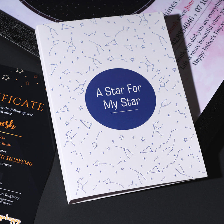 Dads are our real-life superheroes - strong, steady, and always shining. Let’s honour them with something as timeless as their love.Name a star after your dad and surprise him with a gift that’s out of this world. All you need to do is share his name, zodiac, and a special date - and we’ll name a star exclusively for him.The star comes customized with your father's name and a constellation chart showcasing the exact location of the star. You can also add a personalized message to make it even more touching.How does 'Name a Star' actually work?This unique service utilizes the 'Star Dedication Archive,' a comprehensive database of recognized stars in our solar system with their precise coordinates. Once a star is dedicated, it receives a special name and a certificate is generated for it. The registration number on the certificate provides exclusive access to the star's details in the archive, ensuring that no other star will bear the same name.Specifications :Size of the frame (without glass) - A4