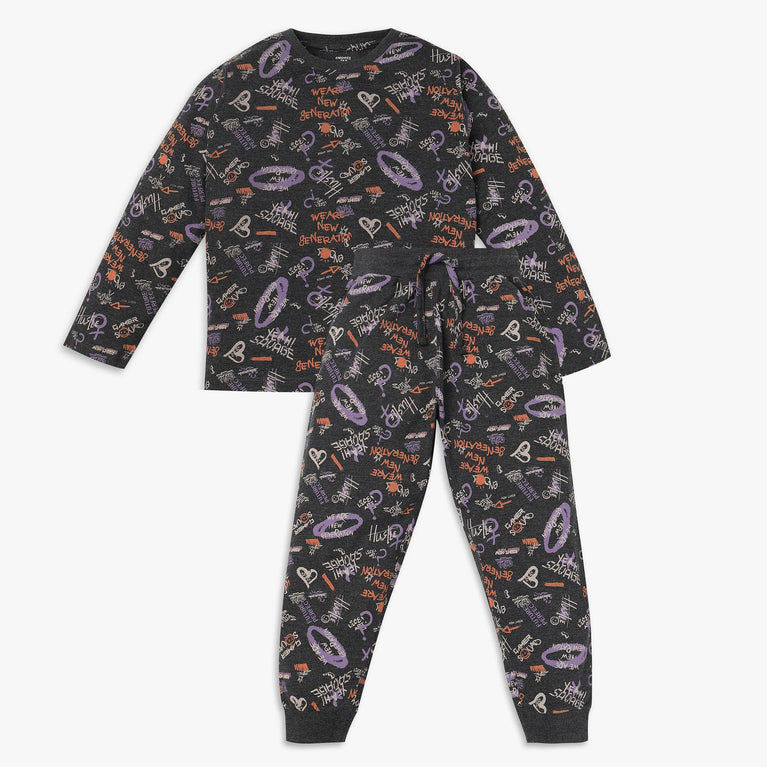 This adorable printed sleep set includes a cozy t-shirt and matching track pants, designed for ultimate comfort during bedtime. Made from soft cotton, this set features a classic crew neck and full sleeves, ensuring your child stays snug and stylish while they snooze.