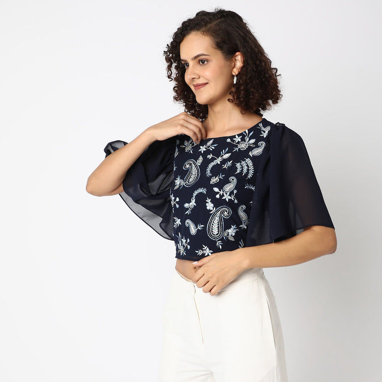 These abstract theme, boxy fit top has crop top length. Made from viscose, it is soft and comfortable to wear.