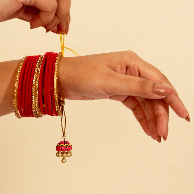 From Rakhi to Earrings, here’s a unique raksha bandhan surprise for your Bhai & Bhabhi. Crafted from eco-friendly terracotta, this sustainable rakhi set features a pair of beautifully crafted lumba rakhis that double as stunning earrings post-celebration. The beautifully designed gift box contains one Rakhi for Brother, one Lumba Rakhi for Bhabhi, and an extra jhumka to turn the Lumba Rakhi into a pair of earrings. Specifications: Size of Rakhi: 2.5 x 2.5cm The box also includes roli and chawal