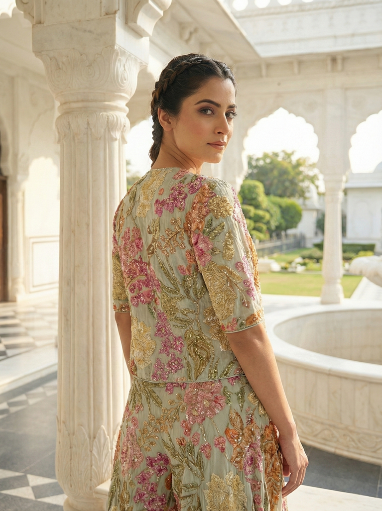 Step into elegance with the Cream Handwork Blouse Skirt Set featuring a coordinating jacket. Beautifully crafted with intricate hand embroidery, this set highlights delicate artistry and refined style. The soft cream shade offers timeless appeal, while the matching jacket adds a layer of sophistication and versatility.