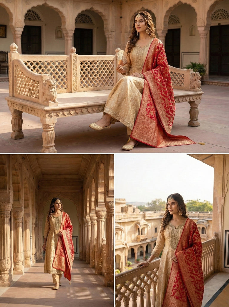 Elevate your ethnic wardrobe with this stunning three-piece ensemble crafted from luxurious cream crepe fabric. Each piece features exquisite heavy stone work that adds timeless elegance and sophistication to your look. The intricate embellishments showcase masterful craftsmanship, making this set perfect for weddings, festivals, and special occasions. The crepe material ensures comfortable wear throughout the day while maintaining its graceful drape.