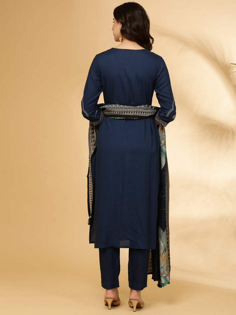 This elegant Cream and Black three-piece suit set features a beautifully printed design enhanced with gold zari embroidery for a subtle yet striking look. Crafted from soft Modal fabric, the anarkali suit includes a cream neck and dhaman sleeves adorned with gold zari laces and delicate sequins, adding a refined shimmer to your outfit. Ideal for festive occasions, this set offers both comfort and style, allowing you to celebrate with grace and confidence.