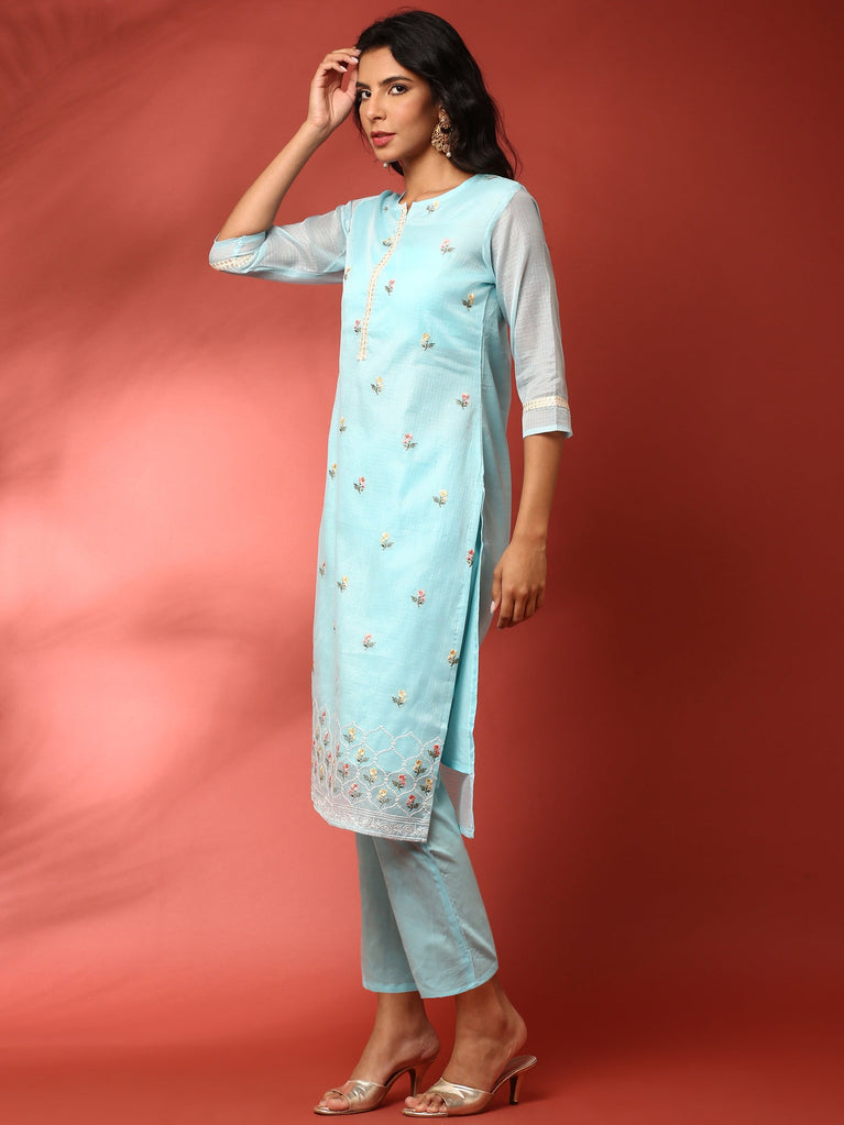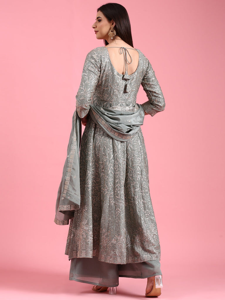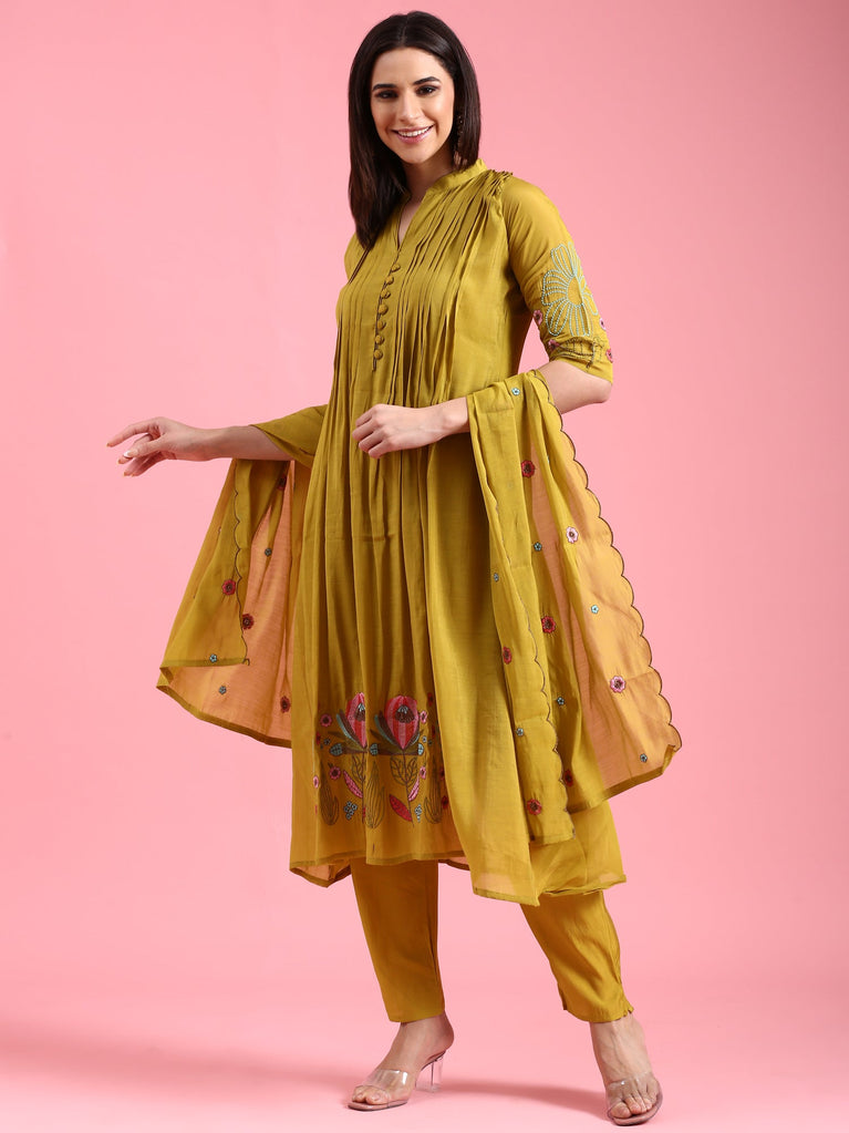 Green Chanderi Embroidery Aline Three Piece Suit Set