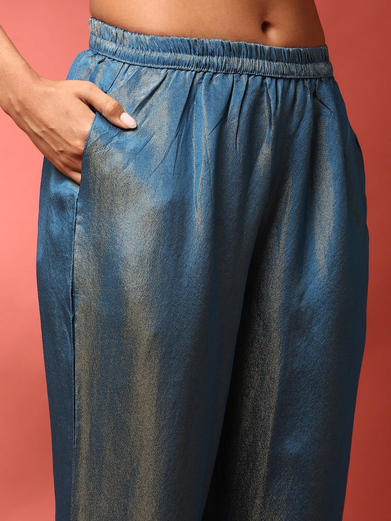 Elevate your ethnic wardrobe with this exquisite green Banarasi silk three-piece set featuring a beautifully embroidered short kurta paired with matching palazzo pants. Crafted from rich Banarasi silk, the ensemble blends traditional artistry with contemporary style, offering both elegance and comfort. The intricate embroidery enhances its luxurious appeal, making it perfect for festive occasions and celebrations.